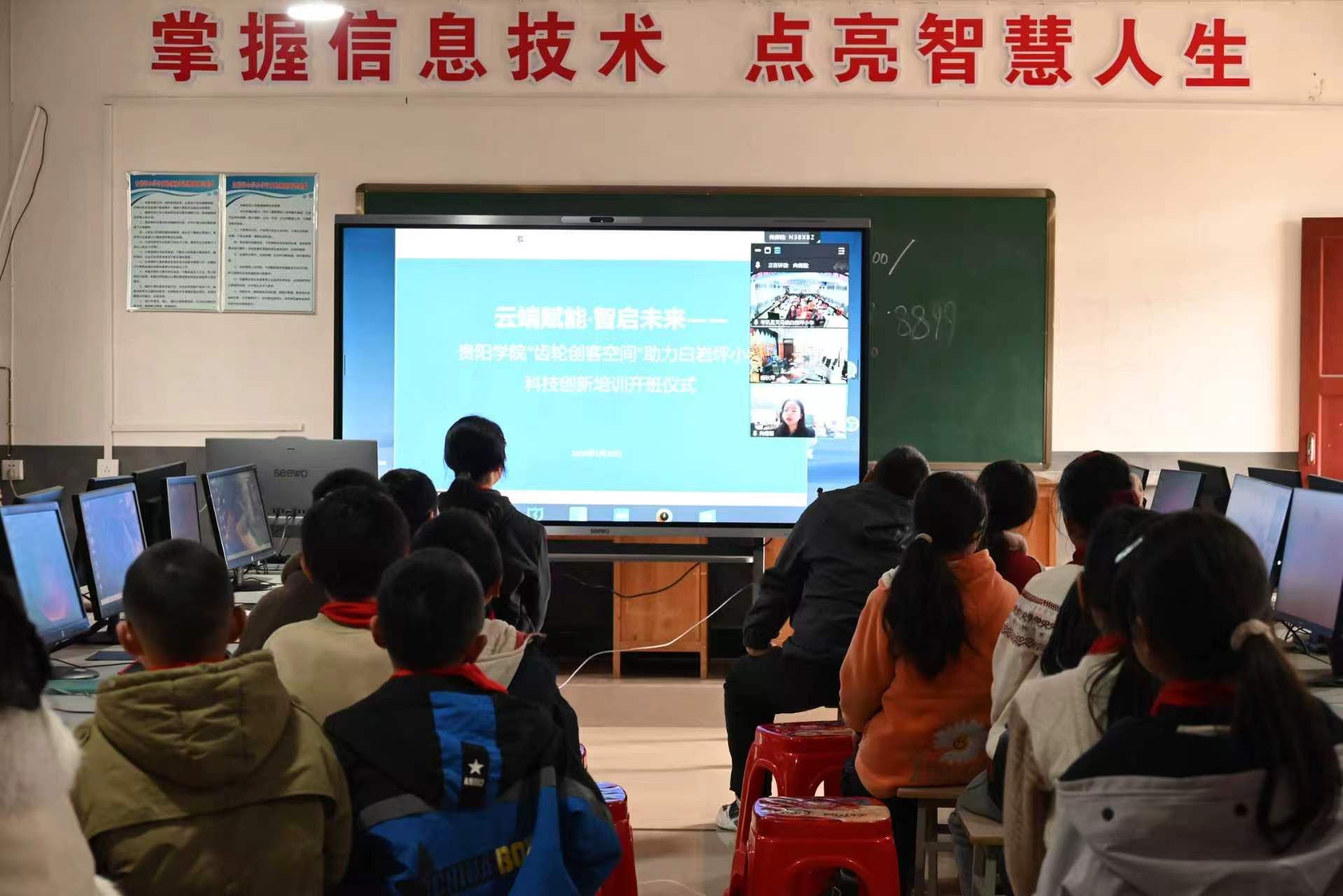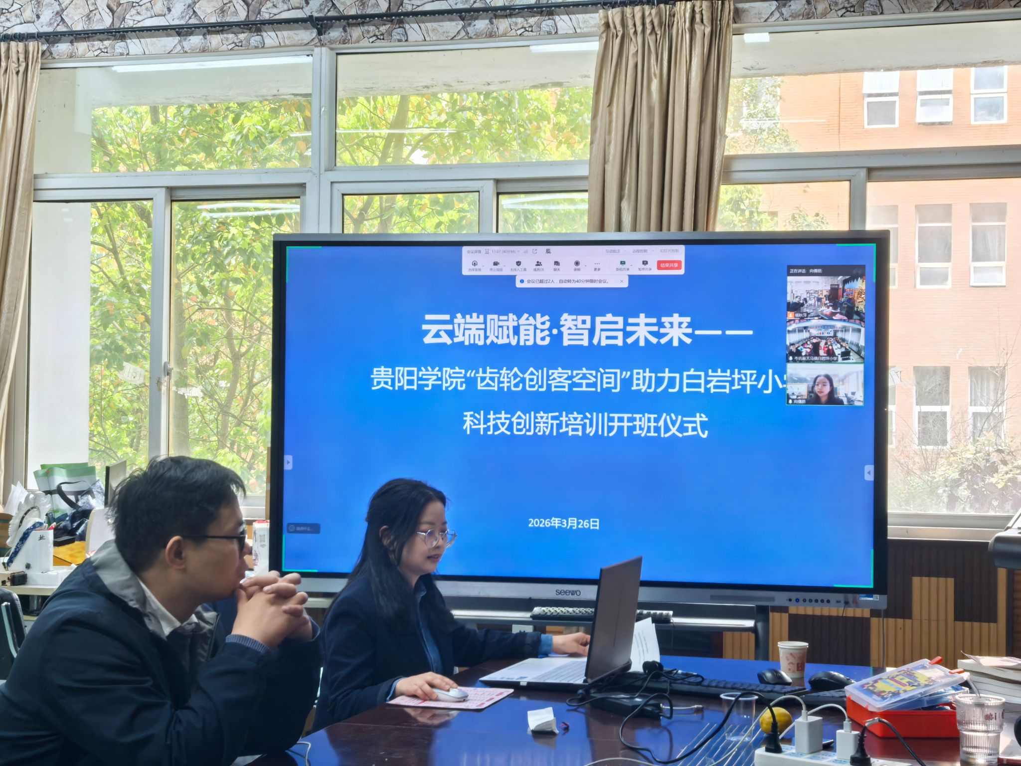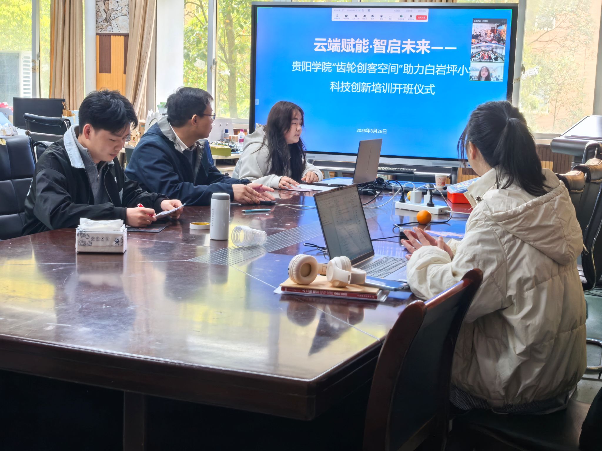 2026年3月26日下午,“云端赋能,智启未来”——贵阳学院齿轮创客空间助力岑巩县白岩坪小学科技创新培训开班仪式在线上举行,标志着实验中心党支部科技帮扶乡村振兴专项行动正式启航。开班仪式由贵阳学院派驻白岩坪村第一书记、实验中心副主任余磊主持。岑巩县天马镇党委相关领导、白岩坪小学校长及师生、实验中心党支部骨干教师齐聚“云端”,共同见证这一重要时刻,并就科技教育帮扶工作进行了深入交流。